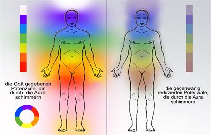 einwirken kann. Das ausstrahlende Licht wird von den Potenzialen des Menschen verändert und zeigt so, welche menschliche Eigenschaften, in welchen Qualitäten vorhanden sind und mit welchen Eigenschaften, Fähigkeiten, Kräften und Befähigungen etc. eine Person leben darf und auch muss. Personen, die noch ihre gottgegebenen Potenziale besitzen oder diese wieder erworben haben, sind in ihrem Selbstausdruck kaum Einschränkungen unterworfen. Mit ihren Potenzialen können sie sogar heilenden Einfluss auf kranke Personen nehmen und die Potenziale ihrer Mitmenschen durch Heilungen