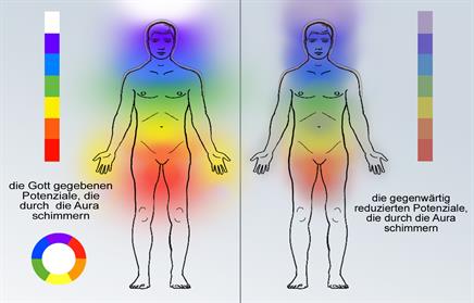 In der Aura des Menschen kann man drei Potenziale erkennen, die in einem roten, gelben und einem blauen Licht auftreten. Diese Potenziale überschneiden sich und bilden in den Bereichen ihrer Überschneidungen überraschender Weise drei weitere Potenziale, die ebenfalls durch die Aura farbig erscheinen. Diese sind das orangene, das grüne und das lila Potential und ihre Farbe und Struktur zeigen an, welche Ausrichtung, Stärke, Menge und welche Frequenz die Potenziale haben. Am Ausdruck der Potenziale können Rückschlüsse gezogen werden, welche eigenwilligen Eigenschaften diese Potenziale noch vorweisen. Alle Potenziale können gleichermaßen genutzt werden, um das Leben auszurichten, neu zu gestalten und an die Gegebenheiten des Lebens, anzupassen. Die Potenziale helfen den Menschen dabei, das Beste aus ihrem Leben zu machen.